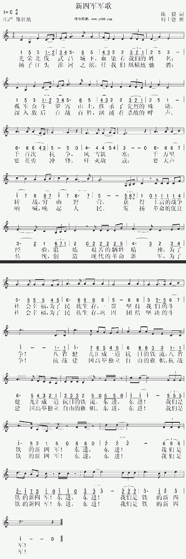 新四军军歌 陈毅词何士德曲 光荣北伐武昌城下, 血染着我们的姓名; 孤军奋斗罗霄山上, 继承了先烈的殊勋. 千百次抗争,风雪饥寒; 千万里转战,穷山野营. 获得丰富的战争经验, 锻炼艰苦的牺牲精神, 为了社会幸福, 为了民族生存, 一贯坚持我们的斗争! 八省靳汇成一道抗日的铁流, 八省靳汇成一道抗日的铁流. 东进,东进!我们是铁的新四军! 东进,东进!我们是铁的新四军! 扬子江头淮河之滨, 任我们纵横的驰骋; 深入敌后百战百胜, 汹涌着杀敌的呼声. 要英勇冲锋,歼灭敌寇; 要大声呐喊,唤起人民. 发挥革命的优良传统, 创造现代的革命新军, 为了社会幸福, 为了民族生存, 巩固团结坚决的斗争! 抗战建国高举独立自由的旗帜, 抗战建国高举独立自由的旗帜. 前进,前进!我们是铁的新四军! 前进,前进!我们是铁的新四军! |