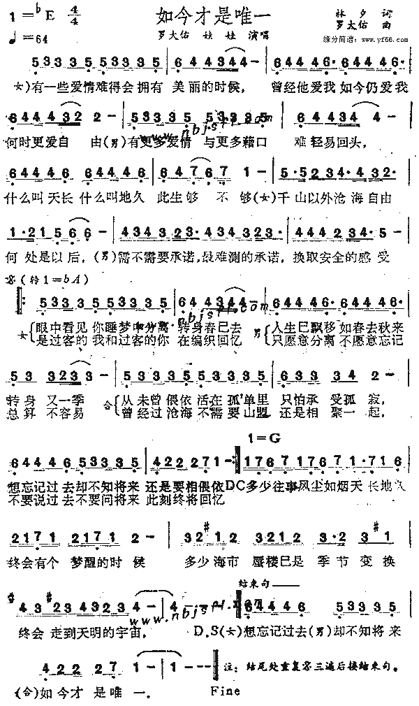 如今才是唯一 作词:林夕作曲:罗大佑演唱:娃娃罗大佑 (女声)有一些爱情 难得会拥有美丽的时候 曾经他爱我如今仍爱我 可是更爱自由 (男声)有更多爱情与更多借口 难轻易回头 什么叫天长什么叫地久 此生够不够 (女声)千山以外沧海自由 何处是以后 (男声)需不需要承诺 最难测的承诺 换取安全的感受 (女声)眼中看见你睡梦中分离 转身春已去 (男声)人生的飘移 如春去秋来转身又一季 (女声)从未曾为你活在孤单里 只怕承受不起 (男声)想忘记过去却不知将来 还是要相偎依 是过客的我或过客的你 在编织回忆 不只愿意分离不愿意忘记 总算不容易 曾经过沧海不需要山盟 还是相聚一起 不要说过去不要问将来 此刻终将回忆 多少往事风尘如烟天长地久 终会有个梦醒的时候 多少海市蜃楼已成季节不朽 终会走到天明的宇宙 music 曾经过沧海不需要山盟 还是相聚一起 不要说过去不要问将来 如今才是唯一 不忘记过去不相信将来 此刻终将回忆 不忘记过去 不相信将来 如今才是唯一 |