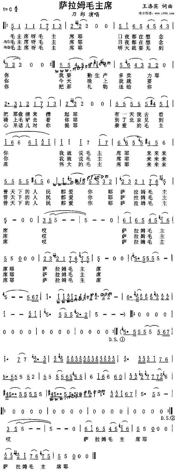 毛主席呀毛主席耶 日夜都在想念你 毛主席呀毛主席耶 日夜都在想念你 我要勤生产多卖力耶 把那盘缠来攒起耶 有一天我去看你 我就说毛主席耶来来来 普天下的人民都爱你耶 萨拉姆毛主席 哎~~萨拉姆毛主席耶 萨拉姆毛主席 (萨拉姆-维吾尔语致敬的意思) 毛主席呀毛主席耶 日夜都在想念你 毛主席呀毛主席耶 日夜都在想念你 今天晚上我就要 骑上毛驴去看你耶 到了北京见到你 我就说毛主席耶来来来 普天下的人民都爱你耶 萨拉姆毛主席 哎~~萨拉姆毛主席 萨拉姆毛主席 (萨拉姆-维吾尔语致敬的意思) 毛主席呀毛主席耶 明天就要见到你 毛主席呀毛主席耶 明天就要见到你 把那礼物送给你 心里话儿对你提耶 亲爱的毛主席 伟大的毛主席耶来来来 普天下的人民都爱你耶 萨拉姆毛主席 哎~~萨拉姆毛主席耶 萨拉姆毛主席 哎~~萨拉姆毛主席耶 萨拉姆毛主席 |