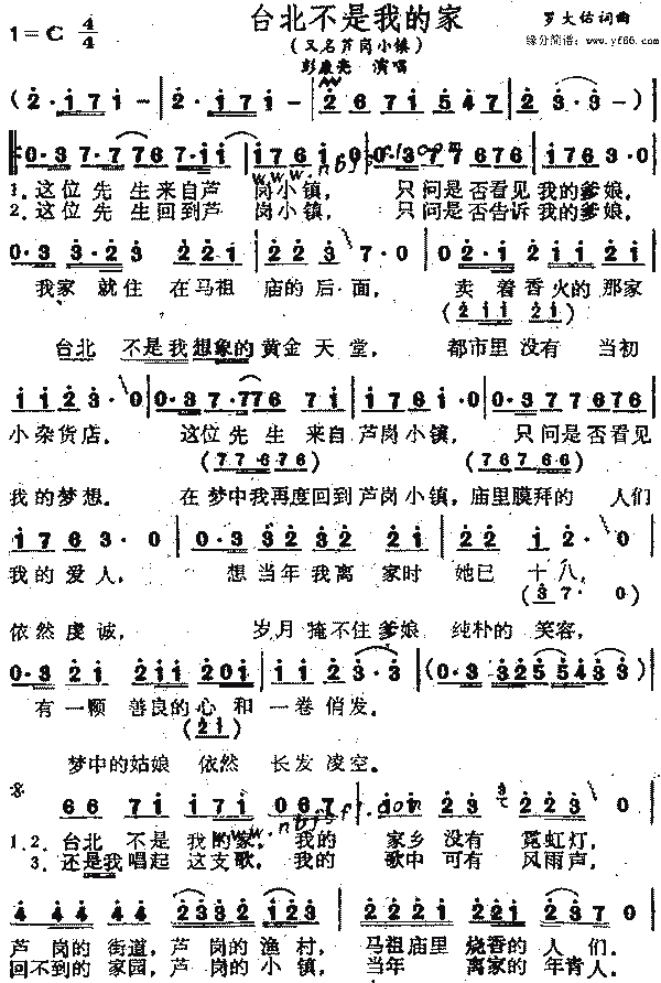 假如你先生来自鹿港小镇 请问你是否看见我的爹娘 我家就住在妈祖庙的后面 卖着香火的那家小杂货店 假如你先生来自鹿港小镇 请问你是否看见我的爱人 想当年我离家时她已十八 有一颗善良的心和一卷长发 台北不是我的家 我的家乡没有霓虹灯 鹿港的街道鹿港的渔村 妈祖庙里烧香的人们 台北不是我的家 我的家乡没有霓虹灯 鹿港的清晨鹿港的黄昏 徘徊在文明里的人们 假如你先生回到鹿港小镇 请问你是否告诉我的爹娘 台北不是我想象的黄金天堂 都市里没有当初我的梦想 在梦里我再度回到鹿港小镇 庙里膜拜的人们依然虔诚 岁月掩不住爹娘淳朴的笑容 梦中的姑娘依然长发盈空 再度我唱起这首歌 我的歌中和有风雨声 归不到的家园鹿港的小镇 当年离家的年轻人 台北不是我的家 我的家乡没有霓虹灯 繁荣的都市过渡的小镇 徘徊在文明里的人们 哦---- 听说他们挖走了家乡的红砖砌上了水泥墙 家乡的人们得到他们想要的却又失去他们拥有的 门上的一块斑驳的木板刻着这么几句话 子子孙孙永保佑世世代代传香火 啊,鹿港的小镇 |