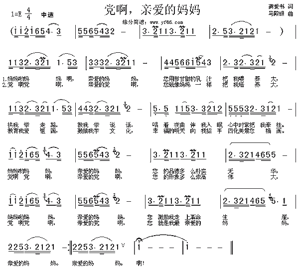 龚爱书余致迪词 马殿银周右曲 妈妈哟妈妈,亲爱的妈妈, 你用那甘甜的乳汁把我喂养大, 扶我学走路,教我学说话, 唱着夜曲伴我入眠,心中时常把我牵挂. 妈妈哟妈妈,亲爱的妈妈, 你的品德多么朴实无华. 妈妈哟妈妈亲爱的妈妈, 你激励我走上革命生涯,亲爱的妈妈. 党啊党啊,亲爱的党啊, 你就象妈妈一样把我培养大,教育我爱祖国, 鼓励我学文化,幸福的明天向我招手,四化美景你描画. 党呵党呵,亲爱的党呵, 你的形象多么崇高伟大, 党呵党呵亲爱的党呵, 你就是我最亲爱的妈妈, 亲爱的妈妈亲爱的妈妈呵! |