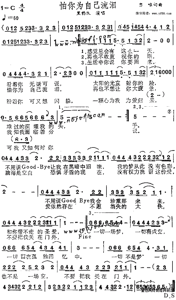 怕你为自己流泪 黑豹 感觉总会有这么一天 看着你无话可说 太阳的光直射你的脸 难过的深埋我的头 再也不敢直视你的眼 怕你为自己流泪 再也不想让你太疲惫 我知我面临着分手 不用说godbye 让我在黑暗中回味 我的梦从此没有色彩 不用说godbye 我会珍重那未来 和你那带不走的圣爱 给我终于说你要回来 盼着你可又想闪躲 一颗心为我为爱归来 可我又如何对你说 脑海是空白 恐惧矛盾的现在 没有权利挽留这份爱 爱依然存在 不愿消失的太快 不要把我关在门外 一切一场梦 一切将成空 一切留在孤独回忆中 一切不是梦 一切也不是一场空 不要把我关在门外 不用说godbye 让我在黑暗中回味 我的梦从此变成黑白 不用说godbye 我会珍重那未来 和你那带不走的圣爱 不用说godbye 我会珍重那未来 和你那带不走的圣爱 |