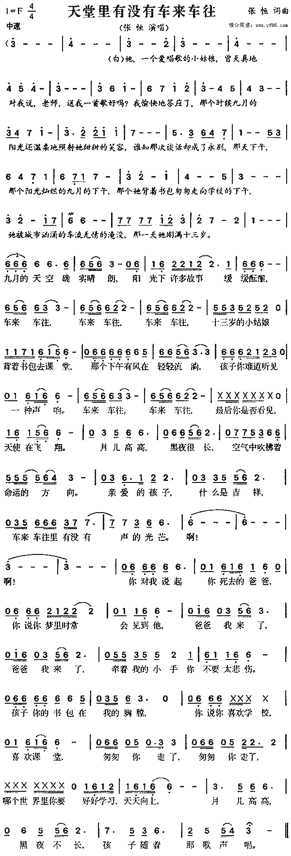 九月的天空,依稀晴朗,阳光下许多故事缓缓酝酿 车来车往,车来车往 十三岁的小姑娘,背着书包去课堂,那个下午有风在轻轻流淌 孩子们难道听见一种声响 车来车往,车来车往 最后你是否看见天使在飞翔 月儿高高,黑夜很长,空中吹拂着迷人的芳香 亲爱的孩子,什么是吉祥 车来车往里有没有神的光芒 你曾说起你死去的爸爸,你说你梦里时常会见到他 爸爸,我来了 爸爸,我来了 亲着我的小手,你不要太悲伤 孩子,你的书包在我的胸膛 你说你喜爱学校,喜欢课堂 匆匆你走了 匆匆你走了 那个世界里你要好好学习天天向上 月儿高高,黑夜不长 孩子睡着了,我为你歌唱 你找到了你的爸爸 那遥远的地方,没有车来车往 那安静的地方,小河在流淌 那洁白的地方,命运没有方向 |