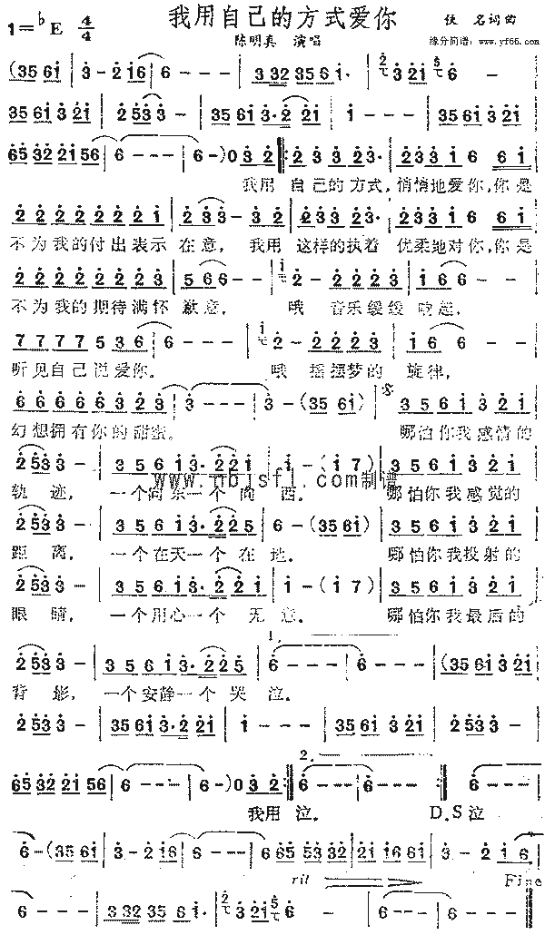 歌词名称:我用自己的方式爱你 歌手:陈明真 专辑:陈明真 歌词: 我用自己的方式悄悄地爱你 你是否为我的付出表示在意 我用这样的执着优柔地对你 你是否为我的期待满怀歉意 喔……音乐缓缓响起 听见自己说爱你 喔……摇摆梦的旋律 幻想拥有你的甜蜜 哪怕你我感情的归依 一个向东一个向西 哪怕你我感觉的距离 一个在天一个在地 哪怕你我投射的眼睛 一个有心一个无意 哪怕你我最后的背影 一个安静一个哭泣 我用自己的方式悄悄地爱你 你是否为我的付出表示在意 我用这样的执着优柔地对你 你是否为我的期待满怀歉意 喔……音乐缓缓响起 听见自己说爱你 喔……摇摆梦的旋律 幻想拥有你的甜蜜 哪怕你我感情的归依 一个向东一个向西 哪怕你我感觉的距离 一个在天一个在地 哪怕你我投射的眼睛 一个有心一个无意 哪怕你我最后的背影 一个安静一个哭泣 哪怕你我感情的归依 一个向东一个向西 哪怕你我感觉的距离 一个在天一个在地 哪怕你我投射的眼睛 一个有心一个无意 哪怕你我最后的背影 一个安静一个哭泣 |
