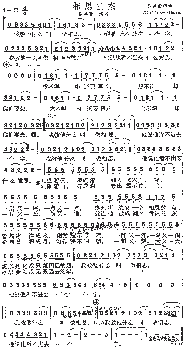 相思三态词曲 张洪量 我教他什么叫做相思 他说他听不进去一个字 我教他什么叫做相思 他说他看不出来什么意思 求不得却还要再求 想不得却偏偏要想 要不得却还要再要 念不得却偏偏要念 我教他什么叫做相思 他说他听不进去一个字 我教他什么叫做相思 他说他看不出来什么意思 求不得就不要再求 想不得就不要再想 要不得就不要再要 念不得就不要再念 我教他什么叫做相思 他说他听不进去一个字 我教他什么叫做相思 他说他看不出来什么意思 我教他什么叫做相思 他说他听不进去一个字 我教他什么叫做相思 他说他看不出来什么意思 望著云聚成绵缠入逃不开唉 一层又一层一点又一点 终究将缠成一个相思的茧 看著冰溶成水化为忘不了 啊一阵又一阵一圈又一圈 我教他什么叫做相思 他说他听不进去一个字 我教他什么叫做相思 想必是化成只能回忆的烟 望著山碎成岩散出握不住鸣 一丘又一丘一堆又一堆 就让它散成漫天情蚀的灰 看著日积成月幻作唤不回 嘿一刻又一刻一天又一天 迟早会幻成无数远去的年 我教他什么叫做相思 他说他听不进去一个字 我教他什么叫做相思 他说他看不出来什么意思 我教他什么叫做相思 他说他听不进去一个字 我教他什么叫做相思 他说他看不出来什么意思 我教他什么叫做相思 他说他听不进去一个字 |