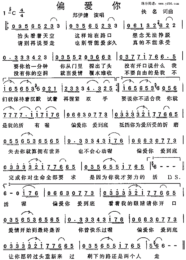 郑伊健偏爱你 词:王中言曲:薛忠铭 抬头看著天空 这样站在路口 想念无法挣脱 要你给一分钟 你从门里探出了头 没有开口说什么 我们就保持著沉默 试著再握紧双手 请别再说要走 也别管能爱多久 真的不能承受 没有你的空洞 就当爱情覆水难收 不要自由的是我 不要说你不适合我 你就是我的所有 喔...偏爱你爱到底 抵挡你为爱所受的折磨 失去你就算拥有世界 也不会心动 喔...偏爱你爱到底 完成你对生命全部要求 是因为你我才努力的活 喔...偏爱你爱到底 看著我的眼睛请你开口 爱情开始到最终 是否你真快乐过 喔...偏爱你爱到底 让你愿转过头从新来过 剩下的路还是两个人走 |