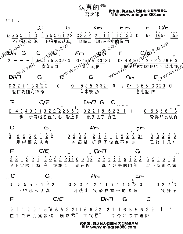 认真的雪 薛之谦 词:薛之谦曲:薛之谦 夜深人静那是爱情 偷偷的控制着我的心 提醒我爱你要随时待命 音乐安静还是爱情啊 一步一步吞噬着我的心 爱上你我失去了我自己 爱得那么深爱得那么认真 可还是听见了你说不可能 已经十几年没下雪的上海突然飘雪 就在你说了分手的瞬间 雪下得那么深下得那么认真 倒映出我躺在雪中的伤痕 我并不在乎自己究竟多伤痕累累 可我在乎今后你有谁陪 爱得那么认真比谁都认真 可最后还是只剩我一个人 漫天风雪请别再把我的眼泪擦去 毕竟那是我最爱的女人 毕竟我曾是她深爱的人 |
