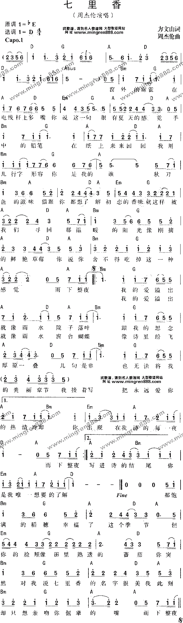 七里香 作曲:周杰伦作词:方文山 窗外的麻雀在电线杆上多嘴 你说这一句很有夏天的感觉 手中的铅笔在纸上来来回回 我用几行字形容你是我的谁 秋刀鱼的滋味猫跟你都想了解 初恋的香味就这样被我们寻回 那温暖的阳光像刚摘的新鲜草莓 你说你舍不得吃掉这一种感觉 雨下整夜我的爱溢出就像雨水 院子落叶跟我的思念厚厚一叠 几句是非也无法将我的热情冷却 你出现在我诗的每一页 雨下整夜我的爱溢出就像雨水 窗台蝴蝶像诗里纷飞的美丽章节 我接着写把永远爱你写进诗的结尾 你是我唯一想要的了解 那饱满的稻穗幸福了这个季节 而你的脸颊像田里熟透的蕃茄 你突然对我说七里香的名字很美 我此刻却只想亲吻你倔强的嘴 |