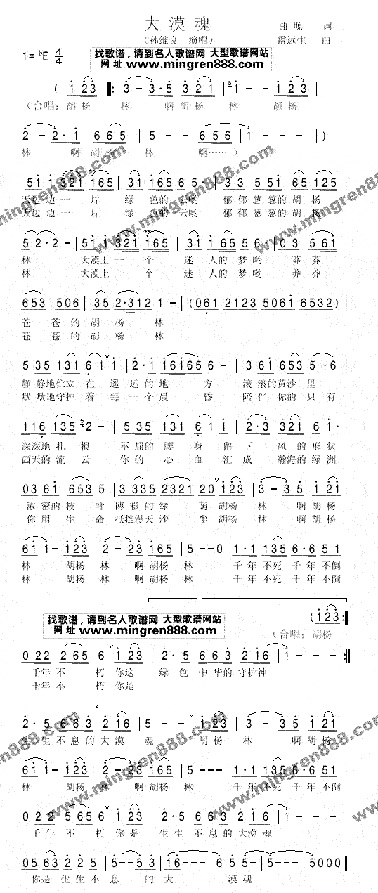 (合唱:胡杨林啊胡杨林,胡杨林啊胡杨林,啊……) 天边边一片绿色的云哟,郁郁葱葱的胡杨林。大漠上一个迷人的梦哟,莽莽苍苍的胡杨林。静静地伫立在遥远的地方,滚滚的黄沙里,深深地扎根。不屈的腰身留下风的形状,浓密的枝叶、博彩的绿荫。胡杨林啊胡杨林,胡杨林啊胡杨林,千年不死、千年不倒、千年不朽,你这绿色中华的守护神。 (合唱:胡杨林啊胡杨林,胡杨林啊胡杨林,啊……) 天边边一片绿色的云哟,郁郁葱葱的胡杨林。大漠上一个迷人的梦哟,莽莽苍苍的胡杨林。默默地守护着每一个晨昏,陪伴你的只有西天的流云。你的心血汇成瀚海的绿洲,你用生命抵挡漫天沙尘。胡杨林啊胡杨林,胡杨林啊胡杨林,千年不死、千年不倒、千年不朽,你是生生不息的大漠魂。 胡杨林啊胡杨林,胡杨林啊胡杨林,千年不死、千年不倒、千年不朽,你是生生不息的大漠魂,你是生生不息的大漠魂。 |