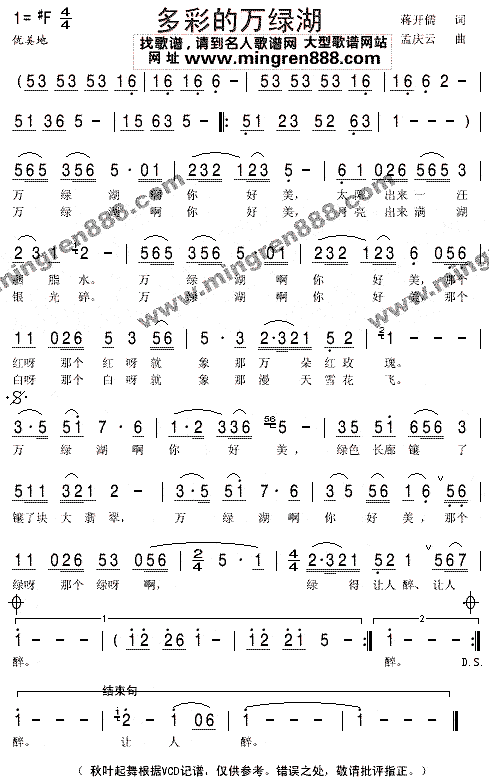 万绿湖啊你好美 太阳出来一汪胭脂水 万绿湖啊你好美 那个红呀 那个红呀 就像那万朵红玫瑰 万绿湖啊你好美绿色长廊镶了 镶了块大翡翠 万绿湖啊你好美 那个绿呀 那个绿呀 啊……绿得让人醉 让人醉 万绿湖啊你好美 月亮出来满湖夜光碎万绿湖啊你好美那个白呀 那个白呀 就象那满天雪花飞万绿湖啊你好美绿色长廊镶了 镶了块大翡翠万绿湖啊你好美那个绿呀 那个绿呀 啊……绿得让人醉 让人醉 万绿湖啊你好美绿色长廊镶了 镶了块大翡翠万绿湖啊你好美那个绿呀 那个绿呀 啊……绿得让人醉 让人醉