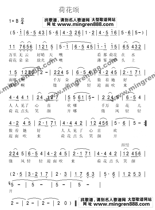 (1)万里无云好晴天,噢…… 看那荷花在水面哪。千万朵花儿数着她好,人人见了心喜欢。 (2)荷花朵朵放光彩,噢…… 薄雾轻纱头上戴哪。微风轻轻迎面吹来,荷花点头笑颜开。
