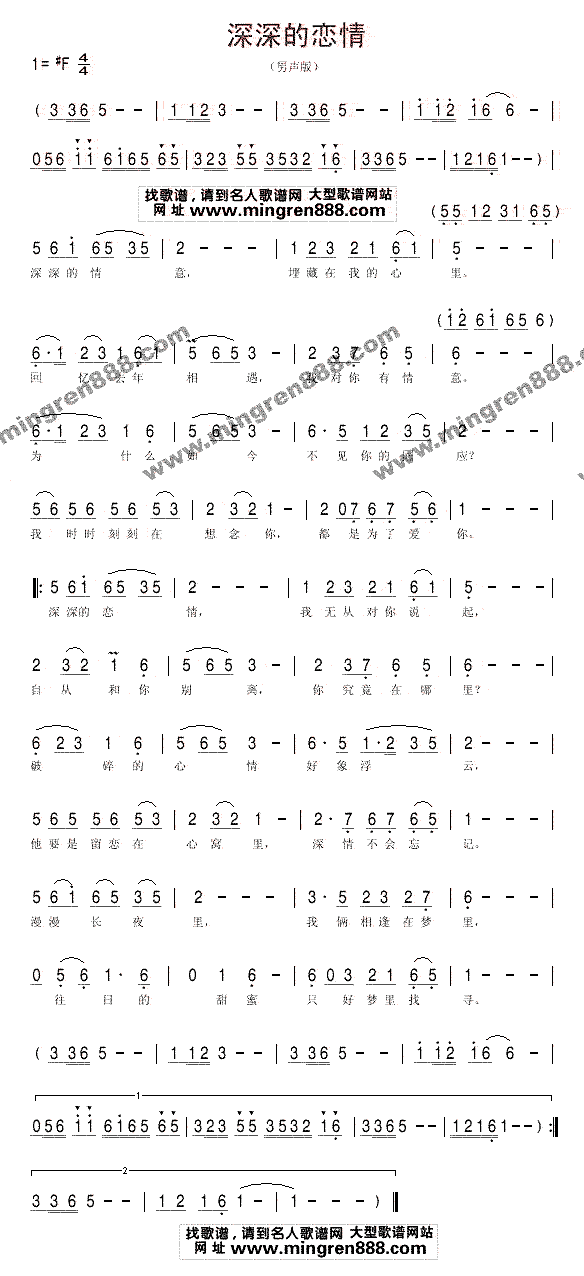 深深的情义,埋藏在我的心里。回忆去年相遇,我对你有情义,为什么如今不见你的回应?我时时刻刻在想念你,都是为了爱你。深深的恋情,我无从对你说起。自从和你别离,你究竟在哪里?破碎的心情好象浮云,他要是留恋在心窝里,深情不会忘记。漫漫长夜里,我俩相逢在梦里,往日的甜蜜只好梦里找寻。深深的恋情,我无从对你说起。自从和你别离,你究竟在哪里?破碎的心情好象浮云,他要是留恋在心窝里,深情不会忘记。漫漫长夜里,我俩相逢在梦里,往日的甜蜜只好梦里找寻。