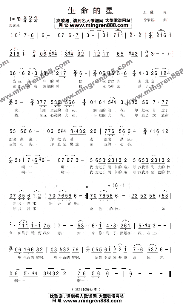 生命的星》王健 词 徐肇基 曲当我少年的时候,我曾经苦苦的追求。但那生活的浪花、汹涌的浪花,却把我带进滚滚洪流、却把我带进滚滚洪流。啊……啊…… 我走过了漫长的路,寻找我那失去的梦, 寻找我那失去的梦。 在那黑夜漫漫的时候,我心中充满了忧愁。而我心灵的火花、不息的火花,却总是燃烧在我的心头,却总是燃烧在我的心头。啊……啊…… 我走过了漫长的路,寻找我那金色的梦,寻找我那金色的梦。 如今你终于回到我身旁,如今你终于照耀在我心上。 啊,生命的星,啊,生命的星,请你不要离开我去远方。啊……啊…… |