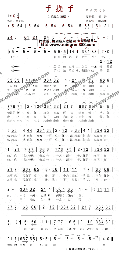 哎……美丽的姑娘见过万万千,只有你一个人最叫人爱恋。你像早晨的太阳无比的新鲜,你的容貌比那鲜花还要鲜艳。你唱起歌来象蜜糖一样甜,你跳起舞来就像那天仙。你勤劳地做工作一人就顶一千,你的名字和故事在天山下流传。那金的银的奖章挂在你胸前,一闪一闪亮堂堂、闪耀着我的眼。 哎……那高高的山峰上点着一盏灯,那是青春的火焰燃烧着我的心。我从高高的山头上走下来,像低头的向日葵向你致敬。你唱起歌来象蜜糖一样甜,你跳起舞来就像那天仙。你勤劳地做工作一人就顶一千,你的名字和故事在天山下流传。我手挽手儿齐奋斗,幸福的生活一定实现。 哎……尽情地歌唱吧、美丽的姑娘,我弹起那冬不拉为你伴唱,啦………… 我们歌唱快乐的新生活,我们歌唱幸福的美好明天。哎嘿……嘿! |