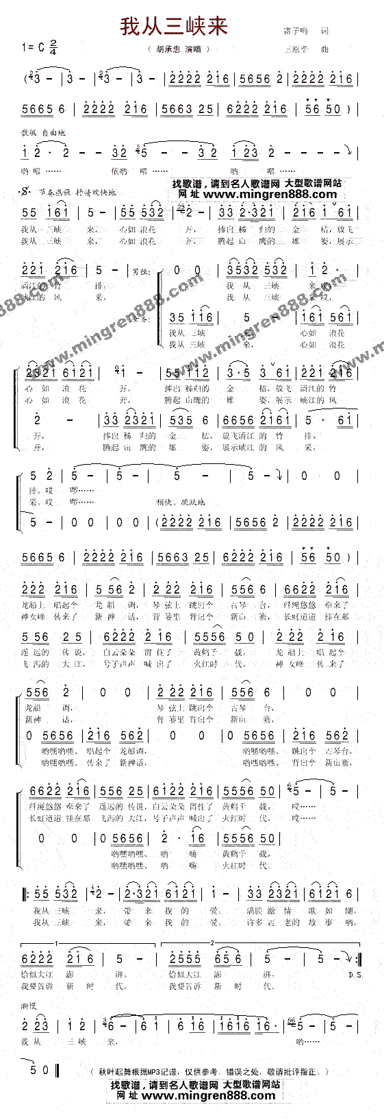 哟喂……咿哟喂……哟喂…… 我从三峡来,心如浪花开,捧出秭归的金桔,放飞清江的竹排。我从三峡来,心如浪花开,捧出秭归的金桔,放飞清江的竹排。哎啰…… 龙船上唱起个龙船调, 琴弦上跳出个古琴台,纤绳悠悠牵来了遥远的传说,白云朵朵留住了黄鹤千载。龙船上唱起个龙船调, 琴弦上跳出个古琴台,纤绳悠悠牵来了遥远的传说,白云朵朵留住了黄鹤千载,哎…… 我从三峡来哎,带来我的爱,满腔激情歌如潮,恰似大江澎湃。我从三峡来哎 ,带来我的爱,满腔激情歌如潮,恰似大江澎湃, 我从三峡来 心如浪花开, 腾起山鹰的雄姿,展示峡江的风采。我从三峡来,心如浪花开。 腾起山鹰的雄姿,展示峡江的风采。哎啰…… 神女峰传来了新神话,背篓里背出个新山寨,长虹道道挂在那飞泻的大江,号子声声喊出了火红时代。神女峰传来了新神话,背篓里背出个新山寨,长虹道道挂在那飞泻的大江,号子声声喊出了火红时代。哎…… 我从三峡来,带来我的爱,许多古老的故事哟,我要告诉新时代。我从三峡来,带来我的爱,许多古老的故事哟,我要告诉新时代。我从三峡来,哟…… |