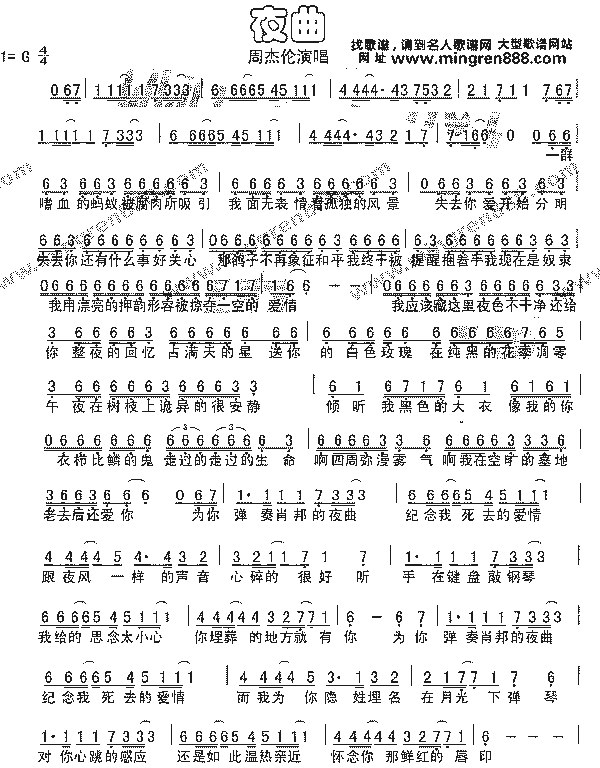 词:方文山曲:周杰伦 一群嗜血的蚂蚁被腐肉所吸引 我面无表情看孤独的风景 失去你爱恨开始分明 失去你还有什黱事好关心 当鸽子不再象徵和平 我终於被提醒 广场上餵食的是秃鹰 我用漂亮的押韵 形容被掠夺一空的爱情 啊乌云开始遮蔽夜色不乾净 公园里葬礼的回音在漫天飞行 送你的白色玫瑰 在纯黑的环境凋零 乌鸦在树枝上诡异的很安静 静静听我黑色的大衣 想温暖你日渐冰冷的回忆 走过的走过的生命 啊四周弥漫雾气 我在空旷的墓地 老去后还爱你 为你弹奏萧邦的夜曲 纪念我死去的爱情 跟夜风一样的声音 心碎的很好听 手在键盘敲很轻 我给的思念很小心 你埋葬的地方叫幽冥 为你弹奏萧邦的夜曲 纪念我死去的爱情 而我为你隐姓埋名 在月光下弹琴 对你心跳的感应 还是如此温热亲近 怀念你那鲜红的唇印 那些断翅的蜻蜓散落在这森林 而我的眼睛没有丝毫同情 失去你泪水混浊不清 失去你我连笑容都有阴影 风在长满青苔的屋顶 嘲笑我的伤心 像一口没有水的枯井 我用凄美的字型 描绘后悔莫及的那爱情 为你弹奏萧邦的夜曲 纪念我死去的爱情 跟夜风一样的声音 心碎的很好听 手在键盘敲很轻 我给的思念很小心 你埋葬的地方叫幽冥 为你弹奏萧邦的夜曲 纪念我死去的爱情 而我为你隐姓埋名在月光下弹琴 对你心跳的感应还是如此温热亲近 怀念你那鲜红的唇印 |