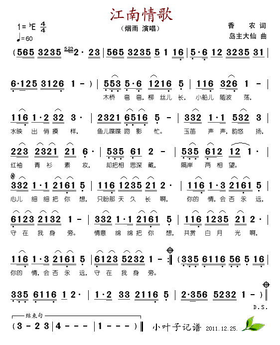 《江南情歌》是歌手烟雨所演唱的歌曲,这首歌曲较多的影响力,现在小编把“江南情歌歌谱”介绍给大家,供大家学习欣赏。