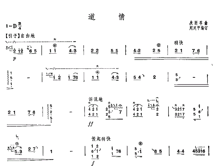 道情,此曲是根据《说道情》、《哭道情》和乔荣堂老艺人的《亮板道情》连缀编订的,84小节后的反复部分有所变化。