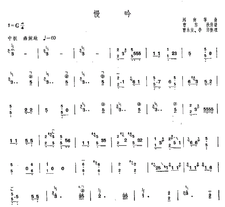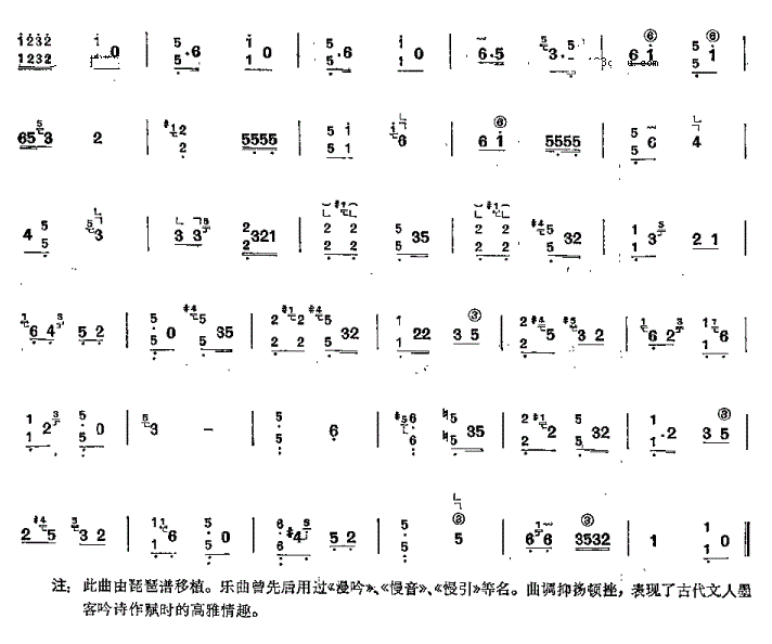 慢吟,此曲由琵琶谱移植。乐曲曾经先后用过《慢吟》、《侵音》、《侵引》等名。曲调抑扬顿挫,表现了古代文人墨客吟诗作赋时的高雅情趣。