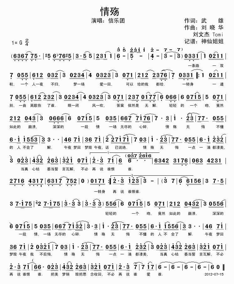 《情殇》是知名组合信乐团所演唱的一首歌曲,《情殇》这首歌曲很有传唱度。现在小编把“情殇简谱”介绍给大家,供大家学习欣赏。