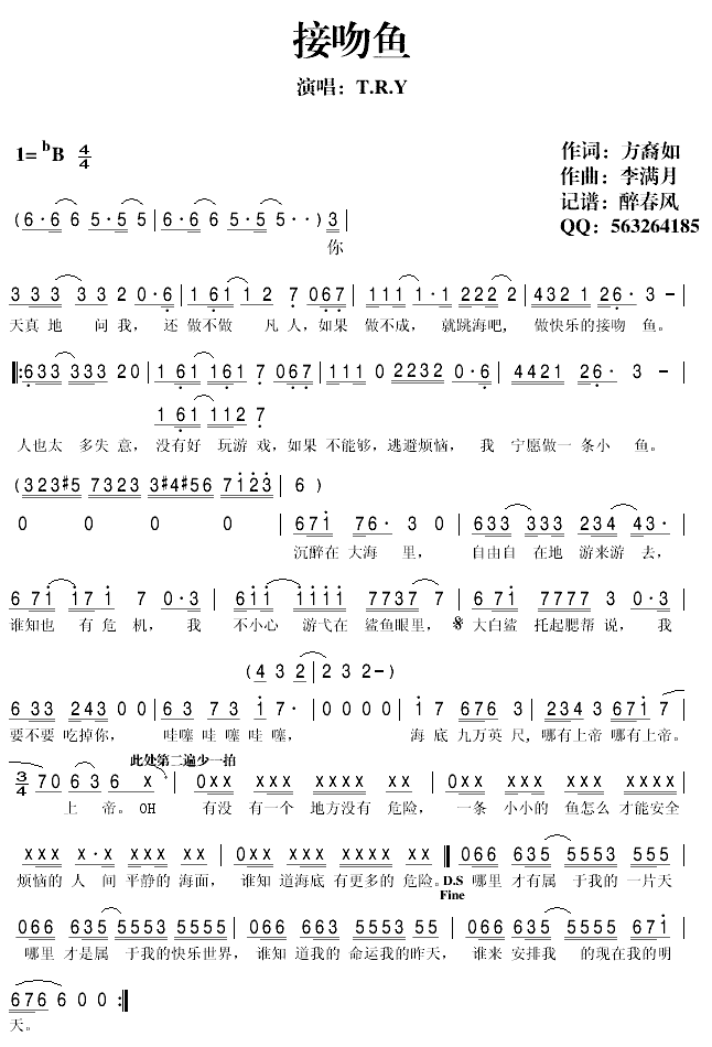 《接吻鱼》是T.R.Y演唱的一首歌曲,收录在专辑《勇敢的女孩》当中。现在小编把“接吻鱼简谱”介绍给大家,供大家学习欣赏。