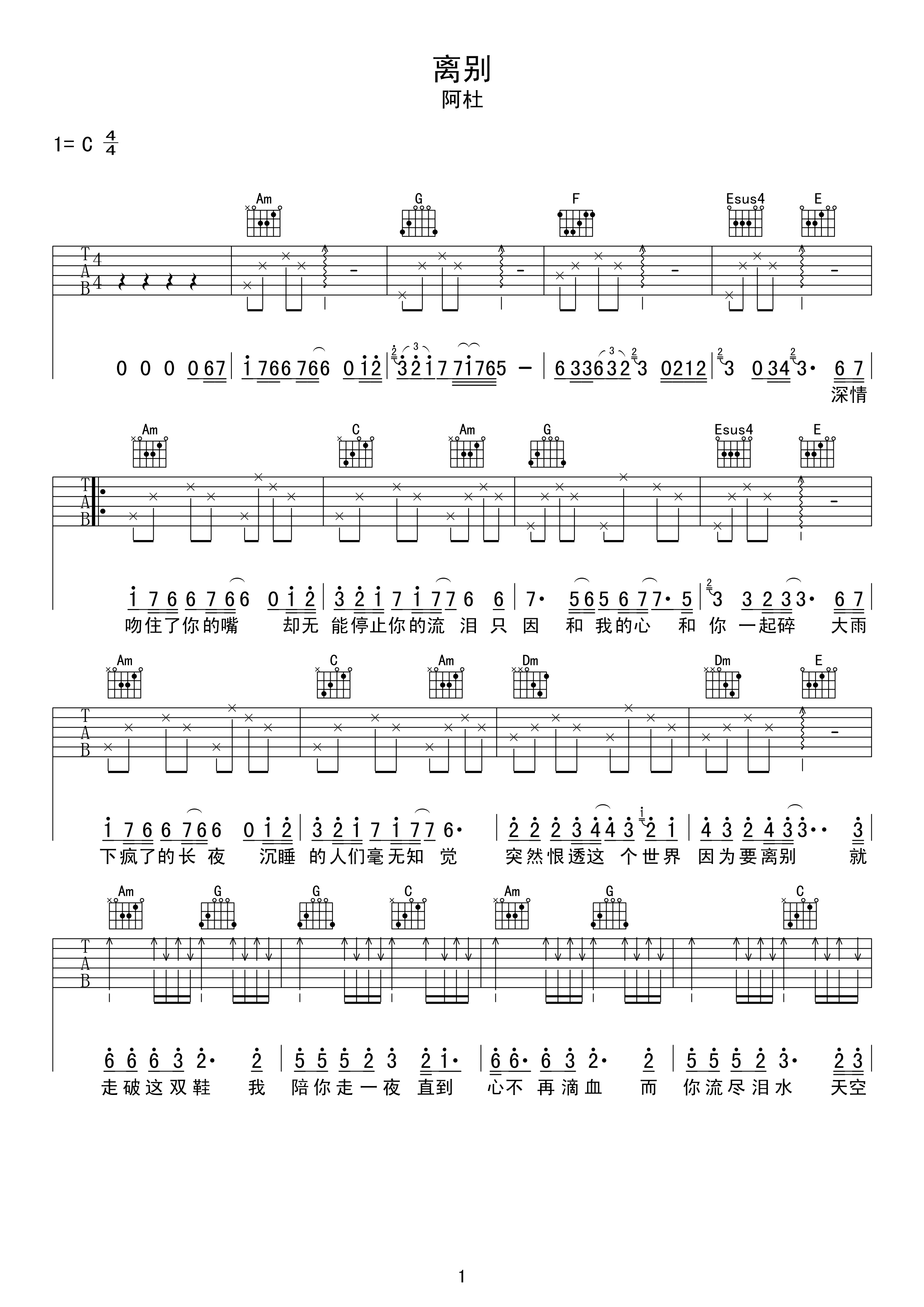 下面是为专门您整理好的:离别吉他谱 阿杜。希望您会满意。
