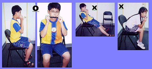 口琴的吹奏姿势如果不佳,除了会影响吹奏的顺畅以外,看起来也不太雅观。以下是正确的姿势: 《坐姿》