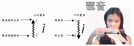 ※左手固定不动,并支撑著口琴,右手则左右推拉,制造两音急速交换出现的颤音效果。