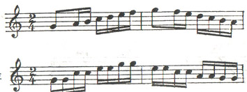 双吐法速度可达到d=126—140连续的十六分音符。这种方法,最宜于演奏下列音型: