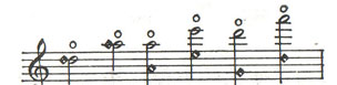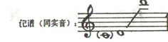 冬不拉可奏泛音,常用的是各弦的丢、吉、丢处的自然泛音。如: