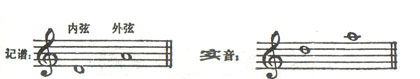 双音 在速度不太快时,板胡可演奏纯五度,大、小六度的双音进行。有时,可利用一根空弦来演奏多种音程的双音。