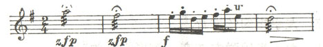 甩弓 当琴弓拉至左半弓时,右手腕持弓迅速的一推一拉,发出两个短促的同度音。甩弓多用于演奏戏曲音乐。演奏符号为 “N”。例: