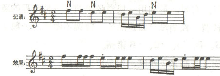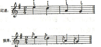 点音是一种装饰音奏法,多用于戏曲音乐。例: