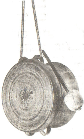 演奏铜鼓时,将鼓悬挂于支架上,一人一手持软槌,一手持竹条演奏。软槌击鼓心,发音浑厚、低沉;竹条敲击鼓边,发音清脆、短促。另一人持共鸣桶,鸣和控制余音的长短。