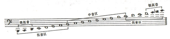 低音长号低音区:声音宽厚,略带沙沙声。最低的几个音少用。