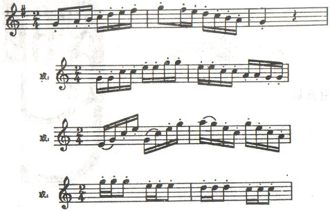 双吐法 适宜于演奏d=120-132连续的十六分音符。最宜于在下列音型中运用。