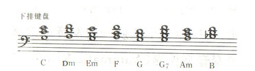 当下排键盘与脚踏键盘相配合演奏和弦音型时,下排键盘的最佳音响位置(也是演奏者最熟练的位置)是在