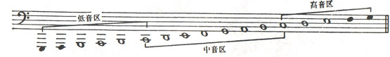 大号低音区:发音低沉,但不够厚实。下加四线以下的音发虚,不能强奏。