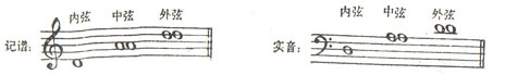 内弦为d,中弦(用同度双弦)为a,外弦(用同度双弦)为d1。相邻两弦之间为纯四、纯五度关系: