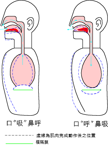 当以上的动作熟习了之后﹐便可尝试加入鼻子作出相反的呼吸动 作。