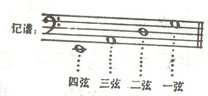 低音提琴按纯四度音程定弦。四根弦由细至粗分别为:第一弦—G弦,第二弦—D弦,第三弦—A弦,第四弦—E弦。例: