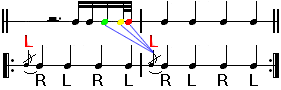 所谓装饰音就是在主拍点之前所打击出的装饰效果音。装饰音所演奏的打击位置通常是在主拍点之前的极短时间出现。记谱法为: ......等。 简单的分,有开与合两种效果的装饰音。差别是在与主拍点的距离时间差。开离的装饰音可以较清楚的听到打击的颗粒(通常使用于进行曲或现代乐)。密合的装饰音则较难出颗粒(通常用于偏古典的乐曲)。不过开与合的使用还是得端看乐曲的风格决定。装饰音一般从一点的装饰音到十几点的装饰音都有,不过再这里我们只谈论一般最常使用的一到四个点的装饰音。 装饰音的打击位置图解: 绿色点的连接线位置代表在极快速度时装饰音所打击的位置。 黄色点的连接线位置代表在快速度时装饰音所打击的位置。 红色点的连接线位置代表在一般速度时装饰音所打击的位置。 以上位置适用于点数少的装饰音,点数多的装饰音只需要把打击的位置再往前推,也就是说随着打击点数或速度的增加,装饰音的打击点也得作相对的提早。