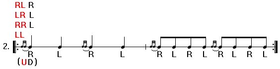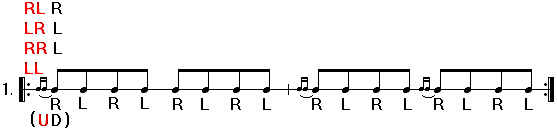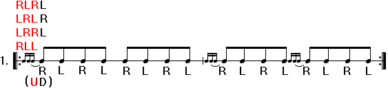装饰音的打击技巧通常有单击和双击混合运用的两种手法。一般单击的装饰音技巧只适用于需要颗粒特别清楚的时候或速度较慢的时候。而双击的装饰音技巧则较无任何速度上的限制。特别要附带提的一点,就是在打装饰音的时候,双手的准备位置通常是在Up的位置,要能打出小声清楚而能达到真正装饰效果的装饰音。要不然本末倒置的话,装饰音的效果可就一点意义都没有了。 一点装饰音: