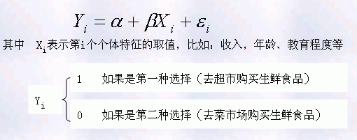 五、超市消费者生鲜购买行为的分析 中国超市生鲜经营面临来自于两方面的竞争,一方面是农贸市场中的个体商贩,另一方面是连锁超市同行之间。前面我们已经提到,超市在竞争中能否取胜的关键是客流量,而门店客流量的大小要看生鲜经营是否有竞争力。因此,研究超市消费者生鲜购买行为,有助于我们了解连锁超市在何种条件下才有可能取代农贸市场。 为了找出哪些主要因素影响消费者选择超市或农贸市场购买生鲜,我们采用了计量经济学中的分类选择模型。在回归模型中当因变量只取两个不同的值时,就是一个二元选择模型(Binary-choice model),假设每一个体都面临二者挑一的选择,并且其选择依赖于可分辨的特征。如果对这种选择运用线性概率模型进行研究,模型的回归形式为: