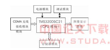 CPU采用TI公司芯片TMS320DSC21。该芯片是TI公司推出的一款基于多处理器架构之上的DSP数字图像处理器。其采用一个ARM7 32 位 RISC 微控制器来处理非成像功能,并用作整个系统的主控制器,同时采用可编程的 C5409 DSP 核心处理图像解码。另外,DSC21 还集成了专门用于处理大部分复杂计算图像任务的可编程协处理器。其中一个协处理器——图像处理引擎iMX执行 DCT、反向DCT,其它协处理器执行可变长度编码/解码、量化与逆量化。 电源模块负责电源的平稳输出和监视。 CDMA无线接收模块接收JPEG数据流,并存放到SDRAM中。图像显示模块将解压后的原始图像在电视或模拟液晶屏上显示出来。 存储器模块由FLASH与SDRAM组成。FLASH存储器用来存储程序,是系统独立运行(脱机运行)必不可少的组成部分。SDRAM存储器用于系统软件的运行以及图像数据的存储。这样可以调用以前的图像数据,用于研究。 调试仿真模块用于调试仿真使用,还可以通过它将图像数据从SDRAM中导入电脑中。