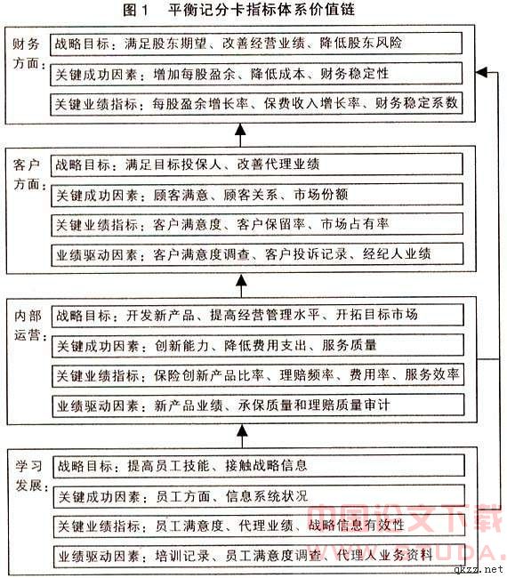 内容摘要:本文通过引入平衡记分卡,从财务、客户、内部运营和学习发展四个方面,构建起以远景与战略为中心的绩效评价体系,并进一步分析了绩效指标体系价值链,为国内保险公司建立科学合理的绩效评价指标体系引入新思路。 关键词:平衡记分卡 保险公司 绩效评价指标体系 指标体系价值链 平衡记分卡(Balanced Scorecard,简称BSC)是哈佛大学教授Robert S·Kaplan和复兴方案咨询公司总裁David P·Norton于1992年提出的一套企业绩效评价体系,在管理会计研究领域引起了广泛关注。BSC是一系列财务绩效衡量指标与非财务绩效衡量指标的综合体,包括财务、客户、内部运营和学习发展四方面内容。 平衡记分卡相关内容简介 平衡记分卡财务方面的指标与传统的财务衡量指标类似,一般包括收入、成本和利润等方面。但是两者又有所不同,由图1可知,平衡记分卡的财务方面指标不是孤立的,它与企业的发展战略紧密联系,集中体现企业的战略目标及实现情况,是企业追求的结果,是另外三个非财务方面的最终目标和衡量标准。非财务指标不是对财务指标的取代,而是对财务指标的补充。如表1所示,客户方面是指企业从客户角度出发评价企业经营效果,主要包括客户满意度、市场份额等内容。将客户方面纳入平衡记分卡绩效管理体系,有助于企业以客户的需求为出发点,制定相应的市场战略和战术,进而产生满意的财务绩效。内部运营方面是指企业从内部业务角度评价企业运营状况。内部业务是形成企业竞争能力的内因,是企业改善经营业绩的重点。顾客满意、实现股东价值都要以内部经营过程为基础。学习发展方面是从企业的学习发展角度评价企业竞争能力的。学习发展是以上三个方面的驱动因素和成功基础,此方面的衡量主要以员工为基础,主要标准有:员工掌握技能的能力和获取战略信息的能力等。平衡记分卡全面考虑了所有的利益相关者,其最大的特点在于其平衡性,主要表现在以下方面: