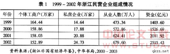 我国加入WTO后,民营企业在跨国经营中会有更多的发展机遇,但面临的环境将更复杂,竞争更趋激烈。浙江民营经济十分发达,且以中小型企业为主导。近年来,在浙江省实施跨国经营战略中,将有更多的民营企业加入到跨国经营的行列。 截至今年底,浙江共有民营企业177.62万户,从业人员679.60万人,注册资金2515.43亿元。下表列出了浙江省1999-今年民营企业的组成情况,从表中可以看出,个体工商户的数量在逐年减少,私营企业的数量一直在增加,总从业人数和注册资金也是逐年增加。今年底,注册资金就比上年同期增加了25.03%。