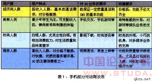 首先,一谈到3G时代的用户需求,很多分析人员首先会想到的是各种各样的数据应用服务功能,如视像通话、在线浏览、互动游戏、高速下载等,但事实上我们必须承认的是,即使是在数据业务高度普及的3G时代,语音通信仍然会是最大的用户需求。欧洲以及日、韩3G运营商的运营数据表明,数据业务ARPU (Average Revenue Per User)所占比例上升的同时,用户的MOU (Minutes of Usage) 并没有出现下降的趋势,相反,在一些价格竞争激烈的地区MOU仍然会有所上升。这说明用户对使用语音通信的需求并没有因为对数据业务的需求上升而降低,终端制造商在研发3G手机时,首要的考虑仍然是要确保3G手机在语音通信方面的表现,在2G手机上广受欢迎的一些功能,如大容量电话簿、和弦铃音、来电情境应用、超长通话时间与待机时间、大容量电池等仍有相当的发展前景。 其次,与欧、美市场不同,中国移动通信用户对于短信(SMS)有着更为强烈的需求,SMS可说是当之无愧的增值业务“杀手级应用” (Killer Application)。在3G时代,消费者的这种消费习惯将在很大程度上获得延续,因此我们认为用户对3G手机的第二项主要需求在相当长的一段时期内是SMS应用。在SMS的输入、存储、转发方面具有独到优势的手机终端仍然会受到市场欢迎。 第三,3G业务的最突出的特点是多媒体数据通信,除了3G的典型应用可视电话以外,3G终端还需要支持各类丰富的数据业务应用,因此从功能上,3G手机需要具备彩色高清晰度显示屏、摄像头、大容量及可扩展内存,从设计上,要考虑到用户使用多媒体业务与语音业务的不同特点,按键及菜单设计要方便简捷。由于数据业务应用极大地丰富,一款手机终端很难做到对所有业务都能进行很好地支持,因此3G时代的手机在设计上对所支持的应用要有所取舍,这也符合用户市场细分的原则—消费者会倾向于购买能够方便地支持自己常用业务的、价格相对合理的手机,而所谓支持“全业务”的手机由于成本很难下降,只会占有少数高端用户市场。 第四,随着消费者对手机产品使用的增加,手机的个性化消费时代也终将到来。不同细分用户市场对手机的需求将体现出各自的特点,靠一两种款式手机包打天下的时代已成为过去,厂家在开发设计、制订市场推广战略时必须要了解这种消费者心理的变化。下表从使用功能上列出了部分细分市场对手机的需求特点: