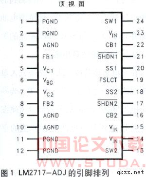LM2717-ADJ是国半公司最近推出的新产品,是一种由两个PWM降压式转换器组成的双输出、电压可调的IC。该器件主要特点:第1路降压式转换器的内部开关管的开关电流可达2.2A(RDS(ON)=0.16Ω);第2路降压式转换器的内部开关管的开关电流可达3.2A(RDS(ON)=0.16Ω);输入电压范围4~20V:输出电压可由两外设电阻设定,最低电压为1.267V;开关频率可设定在300~600kHz范围内,内部有输入欠压保护及过热保护;24引脚TSSOP封装;工作温度范围-40~C~+125℃。 该器件组成的双电源主要应用于TFT-LCD显示器、手持式电子装置、便携式电子产品及膝上计算机等产品 引脚排列与功能 LM2717-ADJ的引脚排列如图1所示,各引脚的功能如表1所示。 有关参数(典型值) LM2717-ADJ有关参数如下;静态电流IQ=2.7mA;基准电压VBG=1.267V;输入电压VIN为4~20V 开关电流限制值:第1路为2.2A,第2路为3.2A;频率设定是电阻RF:RF=4.64kΩ时,Fsw=300kHz;RF=2.26kΩ时,Fsw=600kHz;关闭控制电源正常工作,VH>1.8V,电源关闭,NL<0.7V;输入电压VIN低于3.6V时低压锁存,输入电压VIN高于3.8V时正常工作。 典型应用电路 LM7217-ADJ的典型应用电路如图2及图3所示。图2是一种输入17~20V,输出15V及3.3V的应用电路;图3是在相同输入电压下,输出5V及3.3V的应用电路。这两个电路的基本参数都相同,主要差别在设定输出电压到反馈端的电阻分压器的阻值不同。图2、3中的CBOOTx,(x值是1或2)是自举式升压电容器,它可以提高驱动器的电压,保证N-MOSFET有足够的VQ电压,如图4所示。在上电的瞬间,从VIN→D→CBOOST→LX→COUTS到地的电流给CBOOST及COUTX(包括COUTXA)充电,由于CBOOST<(COUTS+CBOOST),所以VIN的电压大部分降在CBOOST上。CBOOST上的电压VCBOOST等于驱动器电VDRI,保证了N-MOSEFT的VGS电压值。