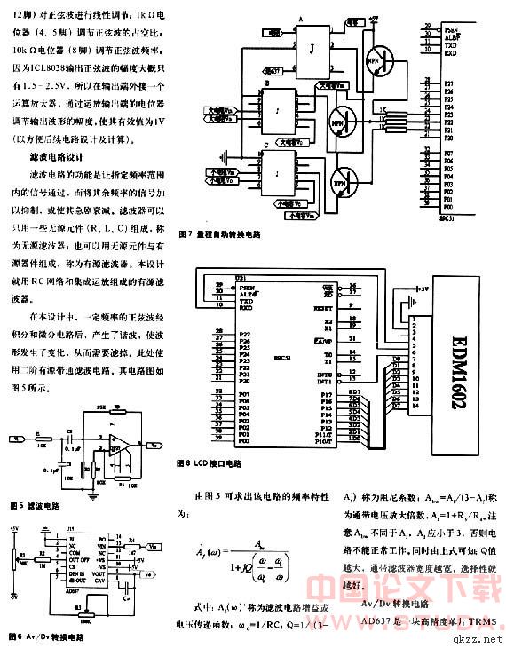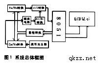 本系统设计所要完成的主要功能是电阻电容的在线测试与显示,总体设计思想为:将电阻电容的参数值转换成与之成正比关系变化的电压输出,经A/D转换,然后送单片机进行数据处理,最后显示。硬件电路主要由以下几个模块组成Cx/V0转换电路、Rx/V0转换电路,信号发生电路、滤波电路、Av/Dv转换电路、A/D转换及单片机接口电路、量程自动转换电路,LCD接口电路。各个模块关系及系统总体框图如图l所示。